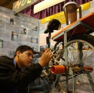 Renato, 16, spent 3 years designing his special Multibike. The contraption looks like a stationary exercise bike. It has wires strung along the frame and a blender strapped to the back. Turning the pedals operates the blender. The same principle can be used to sharpen knives or sweep city streets.