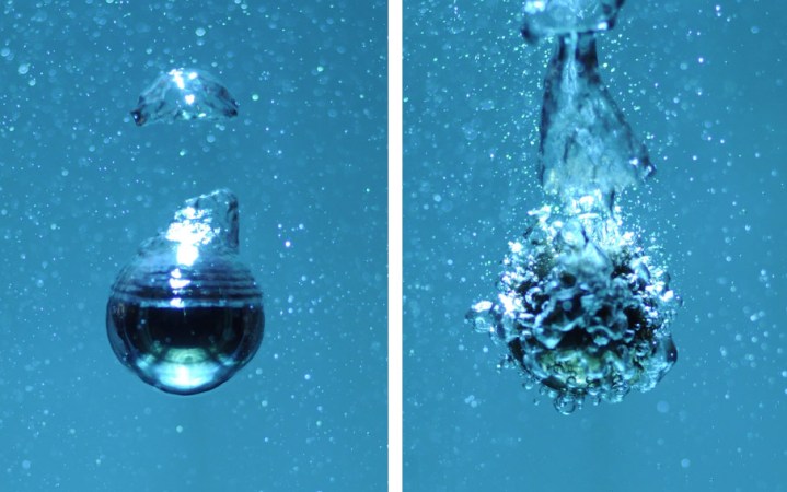 The chemists also coated the same type of metal sphere with chemicals that attract water. When heated and dropped into cooler water, those spheres emitted constant streams of tiny bubbles as they cooled.