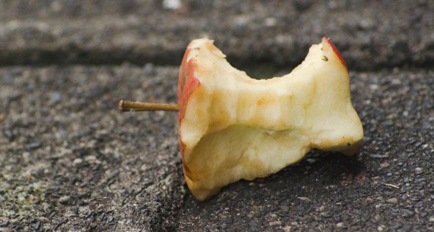 In cities, dropped food — like this apple core — can feed a variety of pests, including disease-carrying rats and pigeons. Fortunately, bugs — including the pavement ant — can make quick work of such food wastes. And that can keep cities clean.