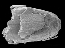 Microscopic view of a burned grain of goat grass found at a Stone Age location in Israel. |