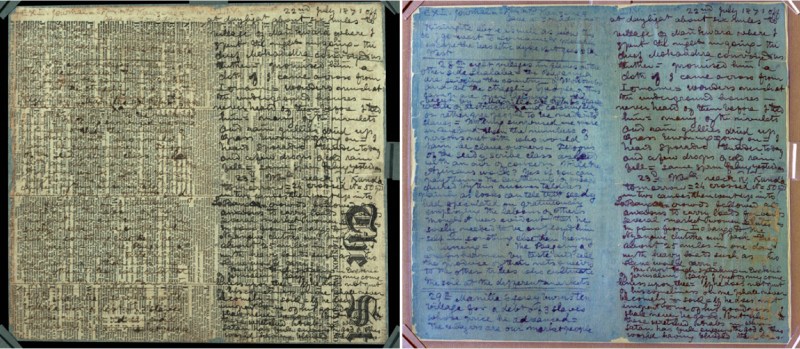 At left is a page of the diary David Livingstone wrote atop a newspaper using ink made from berries. At right is a spectral image processed by computer so that the newspaper print is effectively removed, leaving Livingstone’s words clearly readable.