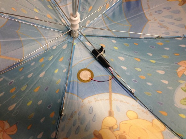 Hut came up with the idea to stick the same type of sensor on an umbrella when he was talking to kids about science. He showed them a photo of a policeman who was holding an umbrella and talking to a crowd in a microphone. Why not put the two together? He thought it could make a cool rainfall sensor.