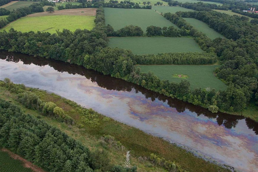 The Kalamazoo River, shortly after an oil pipeline burst on July 25, 2010, spilling an estimated 3.2 million liters (843,000 gallons) of diluted bitumen into the water.