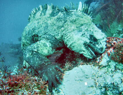 Thick forests of kelp support lots of marine creatures and lure visitors like this Galápagos iguana.