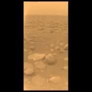The first color image from Titan’s surface reveals an orange sky and rocky landscape. The small “rocks” visible near the Huygens landing site are probably made of water-ice.