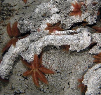 In this view looking down on rocks at a deep-sea vent, sulfide worm tubes lie on the rock’s surface, with the worm’s star-shaped gills sticking out the top.