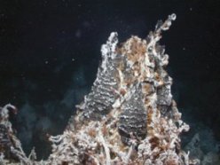This rocky “tower” at a hydrothermal vent hosts heat-loving sulfide worms, marked by their orange gills.
