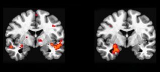 Brains scans show that the brains of teens playing nonviolent games (left) and those of teens playing violent games (right) have different patterns of activity. Those who played violent games showed greater activity in a region of the brain associated wit