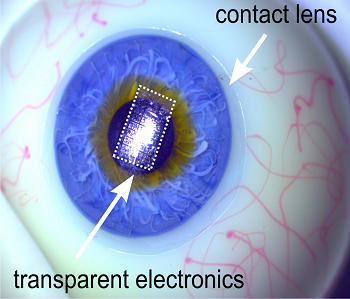 To get this early warning, Salvatore and his colleagues are developing a pressure gauge. Its electrical circuits would sit on a thin film that would be attached to a hard contact lens. The gauge is designed so that the electrical current flowing through its circuits changes when the film flexes. If pressure in the eyeball increases, the shape of the lens will distort. That, in turn, would cause measurable changes to the current in the gauge.