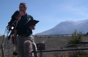 Tom Pierson, geologist and volcano watcher, explains what’s going on at Mount St. Helens to reporters.