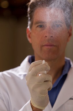 A fine mist of oxytocin partially obscures researcher Paul Zak, of the Claremont Graduate University in California. Working with researchers at the University of Zurich in Switzerland, he designed the nasal spray to send a whiff of the hormone to the brain. When students in his studies inhaled the spray, they became friendlier and more trusting of strangers. Oxytocin is just one of the chemicals associated with love and the feelings it produces in us. Hugs and hormones