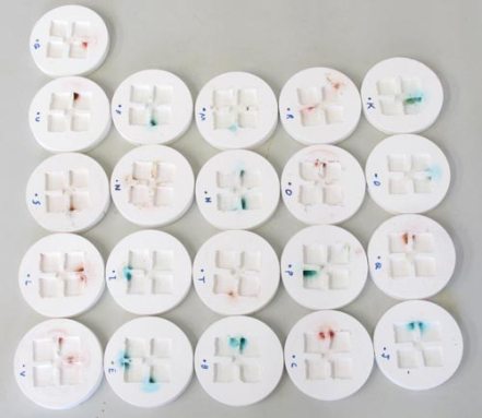 The scientists fed the insects a sugar solution that was colored either red or blue. They also provided a protein food. They marked this with the other food coloring. Once a week for two months, each nest was photographed. Someone unfamiliar with the experiment recorded the locations of any dark patches in the nests and noted what color they were.