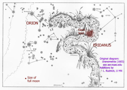 The newly discovered void is located in the constellation Eridanus, which represents a river in Greek mythology. Eridanus, illustrated here, lies near the constellations Orion, Canis Major, and Citus.
