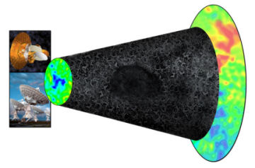 This illustration represents the CMB radiation moving through the universe, and changing temperature on the way—from the Big Bang on the far right, through a spider web of galaxies and clusters of galaxies, to us and our telescopes on the far left, which detect a cold spot (shown in blue). In the center of the diagram is a large void.