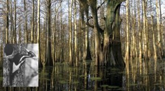 The latest hopes for proving that the ivory-billed woodpecker (inset, from 1930s) hasn’t gone extinct come from sound recordings taken in this area, the Cache River Wildlife Refuge in Arkansas, and neighboring territory.
