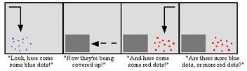 In the second experiment, five-year-olds had to decide whether the total number of blue dots in two sets was larger or smaller than the number of red dots. |