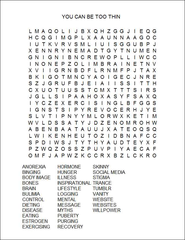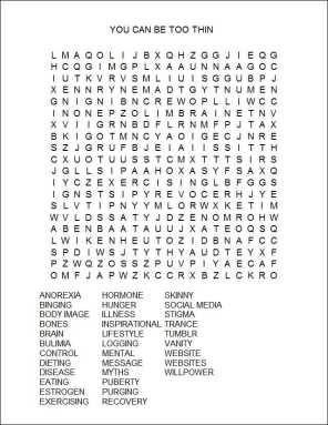 On some of these social media sites, people report how few calories they have consumed. They sometimes encourage others to exercise far too much and too often. They also commonly post images of extremely thin young women, sometimes with protruding bones. Alongside such images are sayings such as, “Be strong and get skinny,” or “No thanks, I am not hungry.”