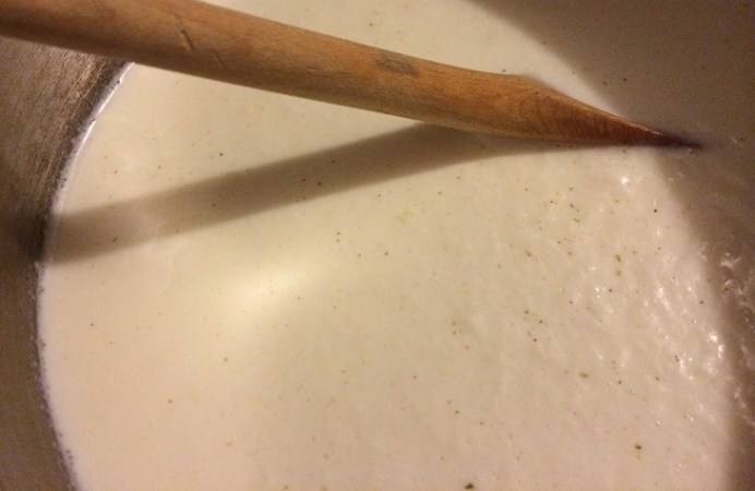 Now I need to slowly heat up my liquids on the stove top. Sticking a thermometer in the pot helped me ensure that the mix won’t overheat. As the milk and buttermilk approach 85° Celsius (or 185° Fahrenheit), the milk’s whey proteins begin to denature, or lose their normal shape. You can actually watch as the proteins appear to fall apart. As this happens, those proteins begin clumping around the now-neutralized casein micelles. This produces big chunks of protein called cheese curd. The liquid left behind is called whey. These are the curds and whey of Little Miss Muffet fame.