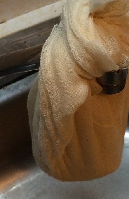 All that’s left is to separate out the curds — our almost-cheese. I carefully scooped them into a cheese cloth. I added salt now and then to give it more flavor. Then I tied the cheese cloth over the ball of curds and left them to hang over sink. This allowed the extra whey to drip out and down the drain. A few minutes later, I had a very basic cheese. It was all thanks to some milk, acid and a little bit of chemistry.