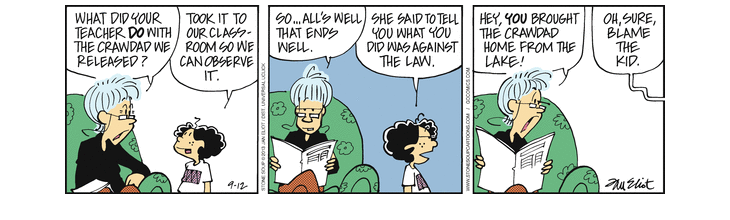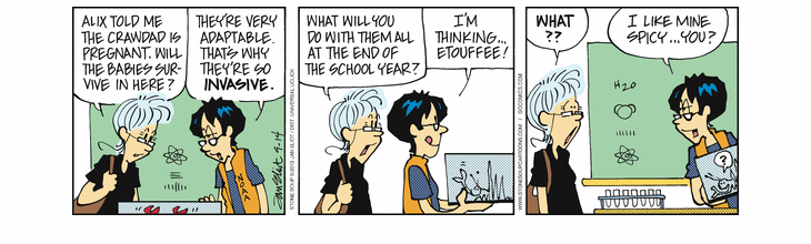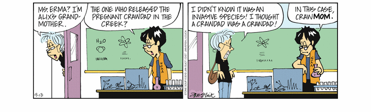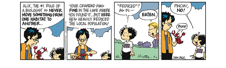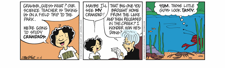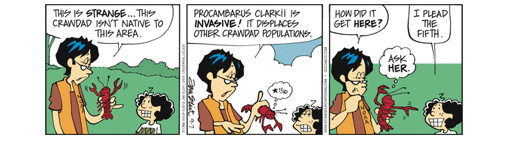 Eureka! Lab did a post on this problem, covering Dr. Samuel Chan’s work asking teachers about releasing invasive species into the wild. Other people have noticed Dr. Chan’s work as well. One of them was Jan Eliot, the artist behind the comic strip “Stone Soup.” She worked with Dr. Chan to write an educational comic strip about invasive species. We are pleased to present it on the blog today!