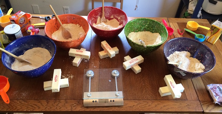 Based on my earlier experiment, I now knew to space my cookies out so I could bake all five types at once and on the same tray. My previous experiment also showed that gluten-free cookies spread more while baking, ending up wide and flat. So I measured the cookie dough before it went into the oven, to make sure all cookies started out with the same amount of dough. For each batch, I changed the position of the cookies on the sheet, making sure that one cookie type was not always stuck in the same place in my oven.