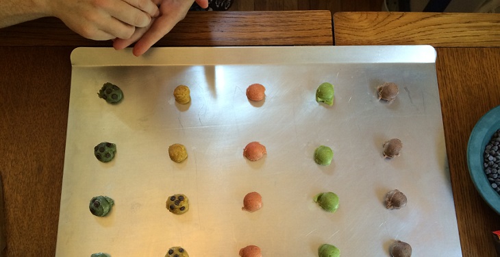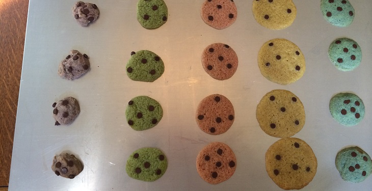 But I don’t know how much xanthan gum to use. To find out, I need to try varying amounts in each batch of cookies. I also need to make sure the xanthan gum is the only active ingredient that changes from batch to batch. (My colorings change too, but they’re not “active” ingredients.) I also need to control — keep constant — as many of my other variables as I can. So I will bake each type of cookie at the same temperature and for the same amount of time. And each cookie will get exactly five chocolate chips, to make sure one is not more chocolatey than another.