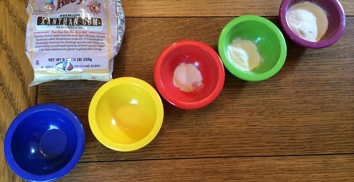 I had a control cookie batch (all the ingredients are listed here) and a batch of cookies that used the same recipe, with gluten-free baking flour instead of wheat flour. I also had three other batches of cookies using the same gluten-free recipe. To each of these batches, I added a different amount of xanthan gum. The first had just half a teaspoon. The next had one teaspoon and the final batch had five teaspoons of xanthan gum.