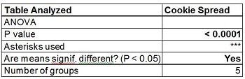 In the table at right you can see the ANOVA for how much the cookies from my five batches spread. My p value is 0.0001, less than 0.1 percent. This suggests that 99.9 percent of the time, I will not see differences this large by chance. This indicates that the xanthan gum I added probably did affect how much my cookies spread.