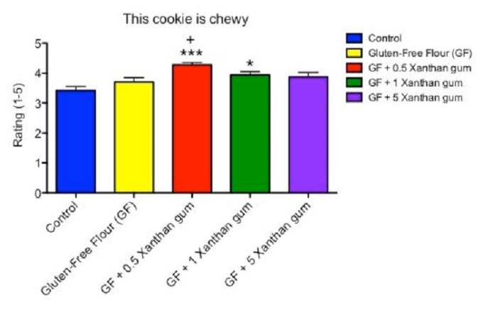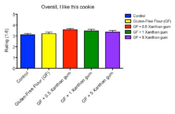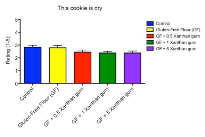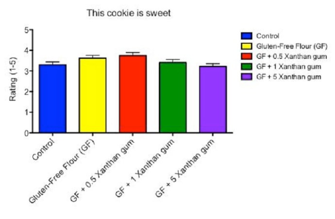 My tasters ranked the five cookies according to how sweet they judged them. You can see in the graph above that there are no asterisks to indicate that one bar is significantly different from another. Neither gluten-free flour nor xanthan gum affected how sweet people judged the cookies.