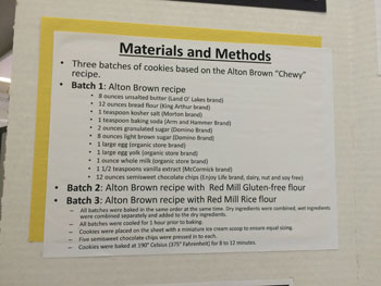 Materials and Methods: I have breakdowns of exactly what materials I used and how I asked people to perform a ranking of my cookies. Now, if people read my poster closely enough, they will be able to repeat my experiment themselves.