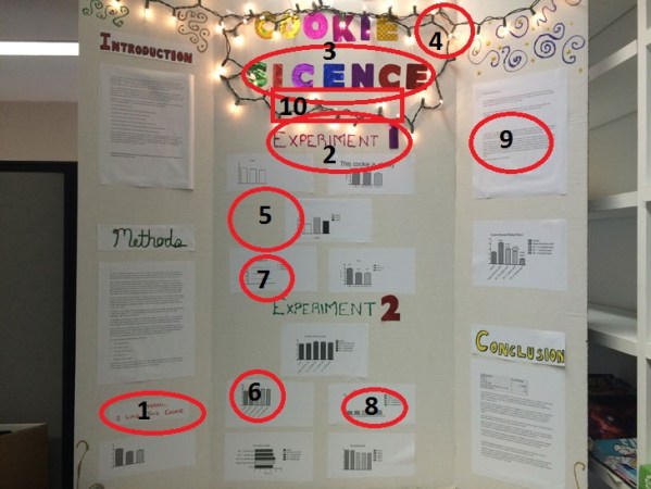 Color! Just because you can’t use lights doesn’t mean a poster needs to be boring. You can use color photos and graph your data in color to catch the attention of people walking by. If your experiment is about cookies, there’s nothing wrong with illustrating a few cookies. And maybe just a little glitter.