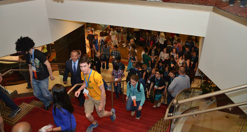 Teen scientists revved up at an opening ceremony with scientists and pogo sticks