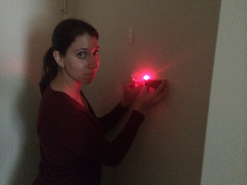 8. Measure the light scatter on the wall. You want to measure the line from the center of the dot to the first major “dark” section. Also measure this in centimeters. It’s usually best to have a buddy, one person to hold the laser pointer and hair, the other to measure the pattern.