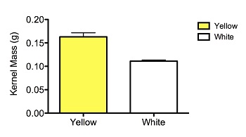 Next, I weighed out one gram of white corn, and another gram of yellow. Then, I counted how many kernels were in each gram.