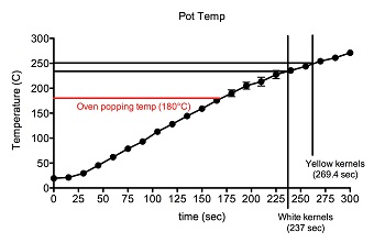 But look at the graph below. Temperature appears on the bottom line. It shows that both the yellow and the white kernels popped when the pot was more than 225 °C on the surface. That’s much higher than the 180 °C the scientists reported in their experiment.