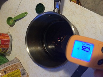 I assembled my equipment: a stove, small scale, pot, cooking oil, timer, infrared thermometer — and, of course, some popcorn. That infrared thermometer measures the heat, or thermal radiation, released from a surface. (Infrared thermometers are easy to find and use. I got mine for less than $20.) Just aim the device at a surface (mine comes with a nice laser to help) and its screen will tell you the temperature of the surface it’s pointed at. It’s a great way to measure the temperature without risking getting your fingers burned.
