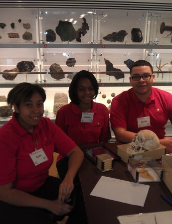 Each station is interactive, meaning that students get to decide what to try, making their own experiments. In one area, you can even try to solve a scientific mystery. When I arrived here, a museum staff member was leading teens through an hour long program called “Grisly Discovery.” Using bones from the museum’s collection, teens try to determine whether a skeleton recovered in West Virginia comes from a 65-year-old woman who went missing. Adult volunteers help students learn to identify a female pelvis from a male’s, to tell how old an individual had been at death and to visually identify bone diseases. These lessons help the teens solve the mystery.
