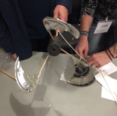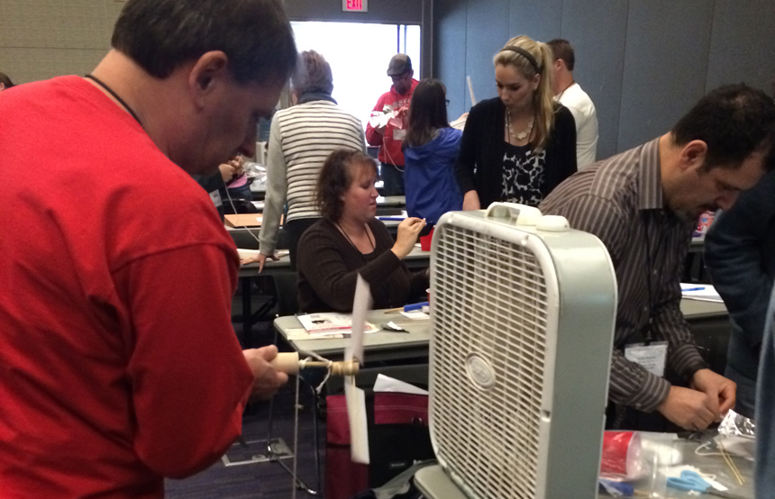 BOSTON – On a breezy Friday afternoon, some teachers at the annual National Science Teachers Association meeting found themselves sitting before a pile of what looked like junk. Each seat had a plastic bag containing a seemingly random assortment of items. A pie tin, a plastic cup, dowels of various sizes, a cork, string, index cards and pieces of foam. Though the venue was cool, large box fans were placed strategically around the room.