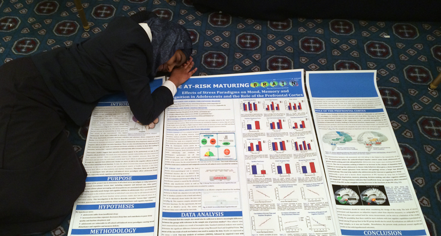 Zarin Rahman models catching some shuteye with her research poster at the 2014 Intel Science Talent Search in Washington, D.C.