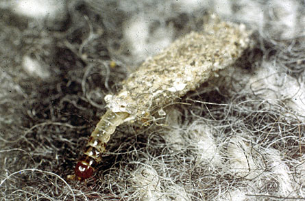 To keep cozy and safe, the clothes moth caterpillar builds itself a case of woolly fibers and hair. The caterpillar burrows inside the case, dragging it around while feeding. The insect pokes its front end out to eat, growing bigger by the day. To adjust, the caterpillar expands its case with snips of hair and fiber found along the way.
