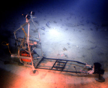 The group also used the submersible to drop off and pick up a special camera system called the Eye-in-the-Sea, or EITS. The system has a video camera inside a waterproof case. The camera sits on a metal tripod that is about 6 feet tall. It films with red light, which most deep-sea animals can’t see, so they don’t get scared away.
