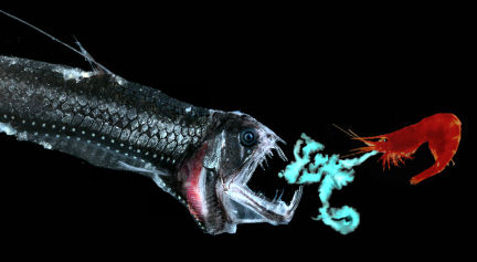 This illustration shows how a deep-sea shrimp might spew a cloud of bioluminescence to distract a viper fish and escape the predator’s hungry jaws.