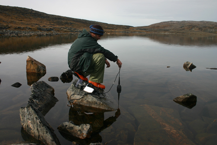 Researcher Sébastien Roy tests the quality of a lake’s water during the 2004 Nunavik Health Survey.