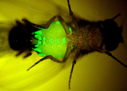 The cells in Drosophila melanogaster that produce pheromones are located in the abdomen. Here, the cells are marked by a green fluorescent protein.