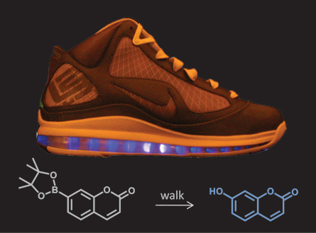Air pockets in the shoe’s sole were injected with two ingredients: water and a chemical that glows when its molecules are broken apart. When the plastic sole is squeezed, such as when you step on it, it sets off a reaction. First, the plastic releases free radicals. The free radicals react with the water to form a substance called hydrogen peroxide.
