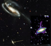 Further analyses and computer simulations revealed that a big galaxy, about the size of the Milky Way, was sucking material, visible as plumes, from a smaller galaxy. The objects are about 2 billion light-years from Earth.